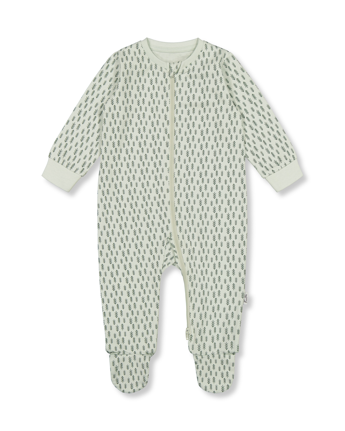 Vaaleanvihreä yöpuku, jossa on Kuusi-niminen kuviointi. Umpilahkeet. Vetoketjukiinnitys. Avautuu molemmista suunnista.