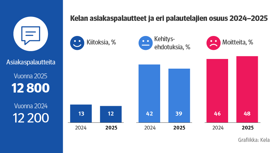 Vuonna 2025 Kelan palautejärjestelmässä käsiteltiin 12 793 asiakaspalautetta. Palautteiden määrä kasvoi hieman vuodesta 2024 (+ 5 %). Valtaosa palautteista koski Kelan etuuksia ja palveluja.