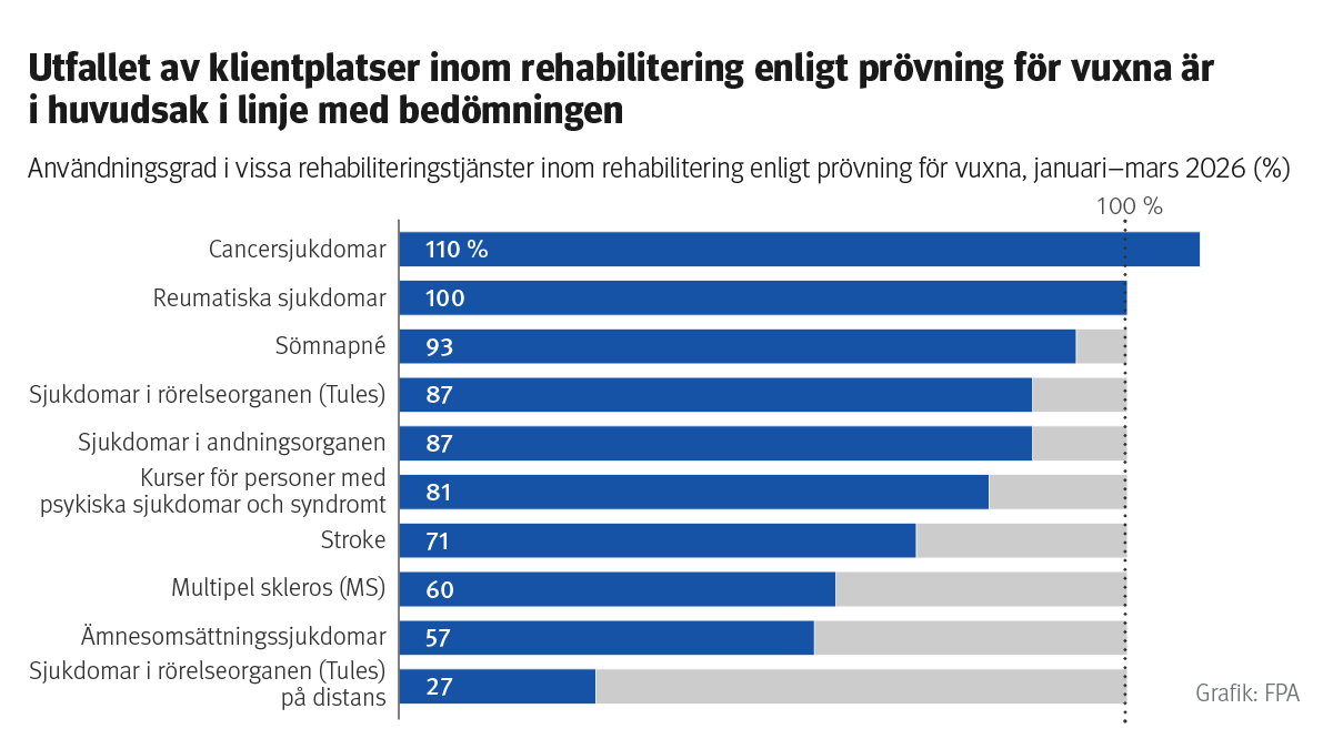 Också i fråga om rehabilitering vid cancersjukdomar och psykiska sjukdomar motsvarar klientantalet i början av året i stort sett den uppskattning som gjordes för januari–mars. Det här tyder på att rehabiliteringsbehovet identifieras och att hänvisningen till dessa tjänster fungerar på planerat sätt i början av året.
