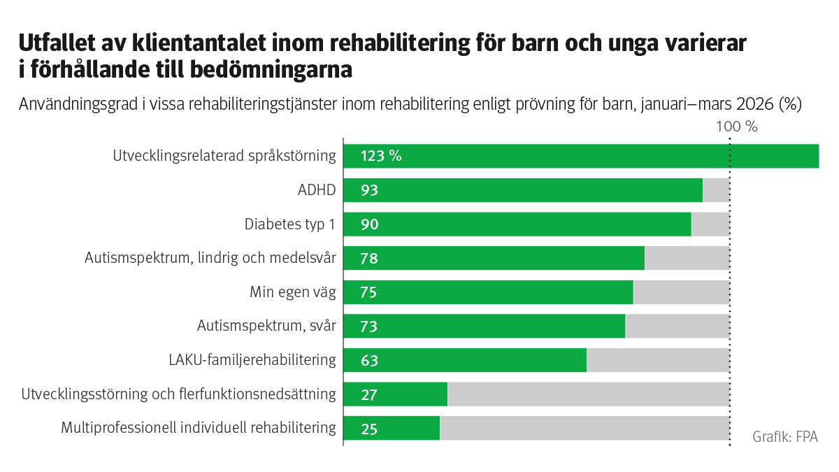 I fråga om rehabilitering för barn och unga med adhd, typ 1-diabetes samt lindrigt eller medelsvårt autismspektrumtillstånd motsvarar antalet klienter i januari–mars i stort sett den uppskattade nivån.