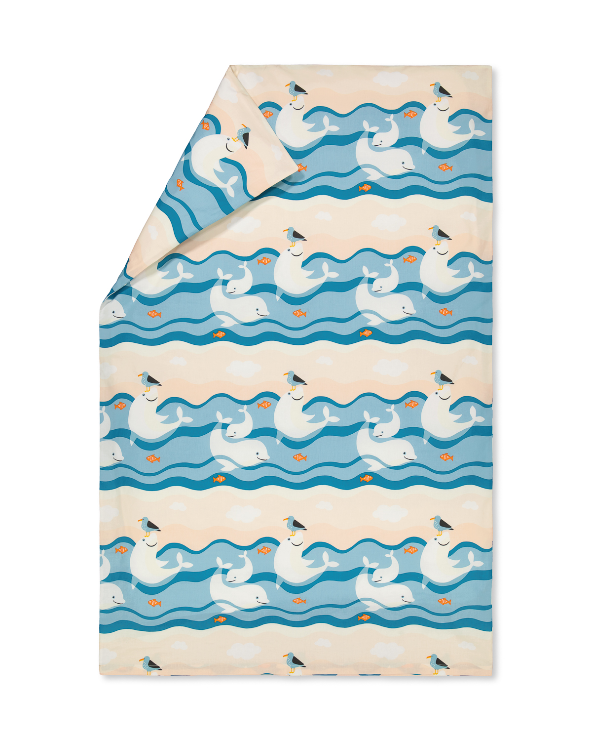 Multicoloured duvet cover with whale pattern. Size: 85 x 130 cm. Material: organic cotton (100%).