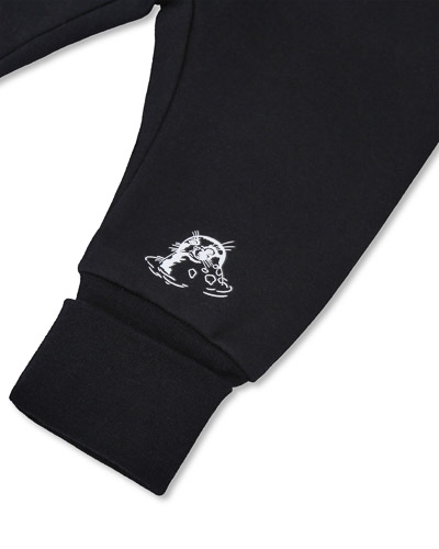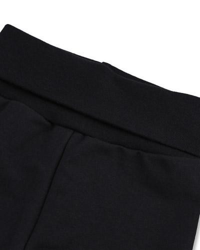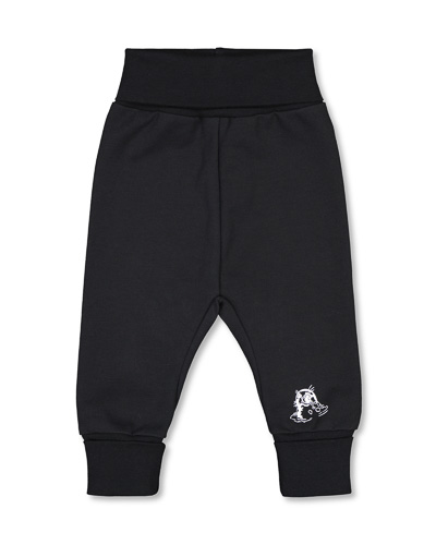 Black trousers with print called Saimaa on one leg. Foldable stretch fabric at the waist and legs.