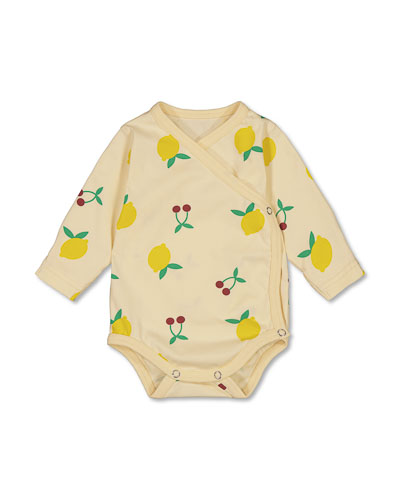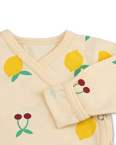Wrap-around bodysuit with pattern called Cherry and Lemons. Fastened with snap buttons. Foldable cuffs.