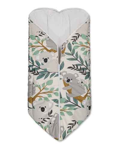 Sleeping bag that can be closed on the side with a zipper. Pattern called Koala on beige background. The pattern was designed by Sara Söderström. The pattern won the public voting for the 2024 edition of the maternity package. The winning pattern received 45.3% of the 12,596 votes.