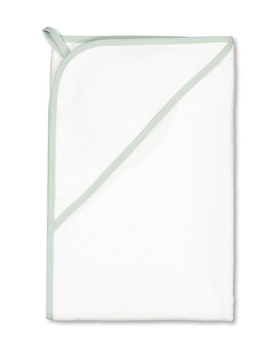 Vit badhandduk med huva, grön kantning. Huvan har upphängningsögla.