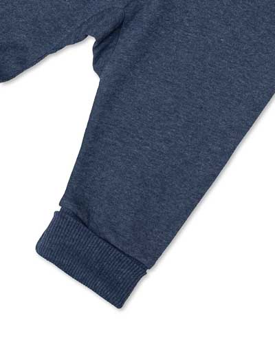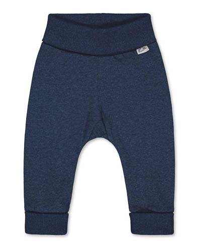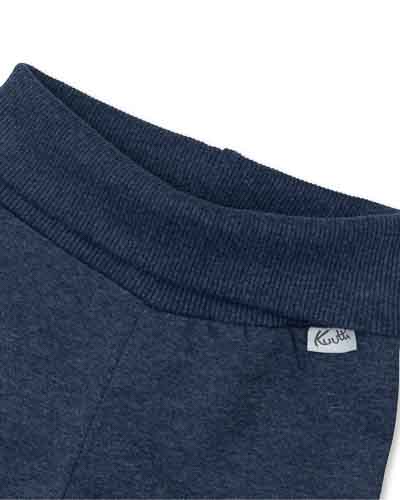 Blåa byxor med vändbar resår i midja och ben.