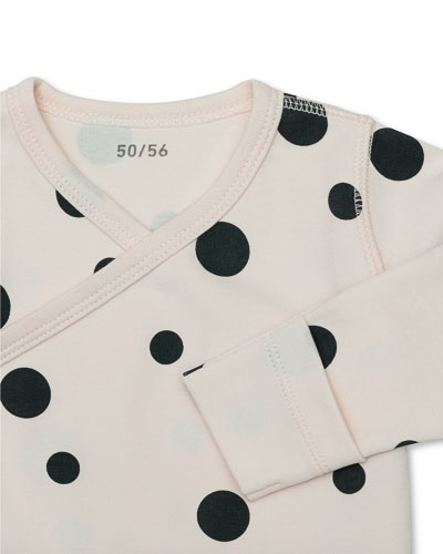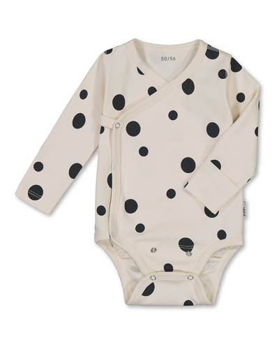 Långärmad naturvit omlottbody med bollmotiv. Fästs med tryckknappar, justerbar i grenen. Vändbara muddar.