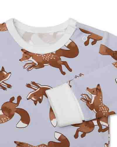 Långärmad body med rävmotiv. Löstagbar förlängningsdel, fästs med tryckknappar. Vändbara resårer i muddarna. Båtringing.