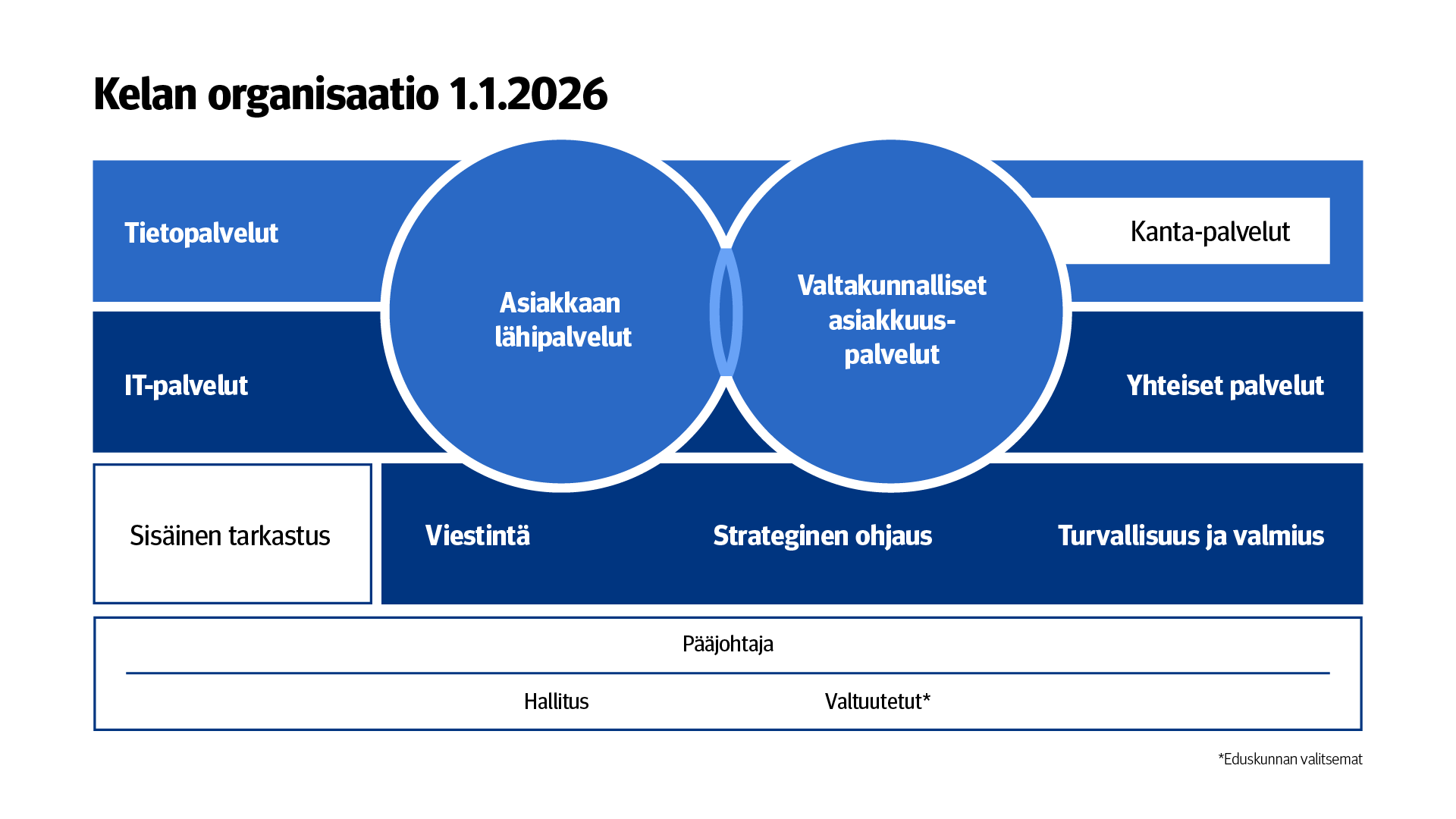 Strategisen ohjauksen yksikkö vastaa Kelan kehittämisen johtamisesta, strategisesta johtamisesta, henkilöstö- ja talousjohtamisesta sekä lainsäädännön kehittämisen johtamisesta ja yhteiskuntasuhdetyöstä.